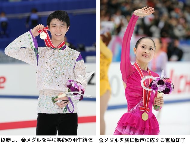 羽生、300点超える圧勝=宮原初V、浅田3位-NHK杯フィギュア ―― フィギュアスケートのグランプリ(GP)シリーズ第6戦、NHK杯第2日は28日、長野・ビッグハットで男女フリーなどが行われ、男子はショートプログラム(SP)首位の羽生結弦(ANA)がフリーでも216・07点で1位となり、合計322・40点で優勝し、GPファイナルへの出場を決めた。いずれも歴代世界最高得点で、300点台は史上初の快挙。金博洋(中国)が2位、無良崇人(洋菓子のヒロタ)は3位、田中刑事(倉敷芸術科学大)は5位に入った。