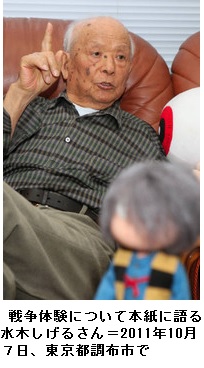 戦争体験を投影した漫画も印象深い。二十一歳で故郷の鳥取連隊に入営し、ニューブリテン島へ。空襲や銃撃に加え、飢えに苦しみ、ワニやマラリア蚊におびえた。さらに玉砕命令が水木さんら兵隊を追い詰めた。戦記漫画「総員玉砕せよ!」に書いたことの九割近くが「本当です」。そう言った時の真剣なまなざしは、戦争への深い怒りに満ちているように見えた。