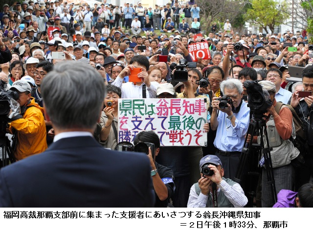 翁長氏「未来切りひらく判断を」 辺野古訴訟で意見陳述 ―― 米軍普天間飛行場(沖縄県宜野湾市)の移設先とされる同県名護市辺野古の埋め立て承認を取り消したのは違法だとして、取り消しの撤回を求めて国が翁長雄志(おながたけし)知事を訴えた代執行訴訟の第1回口頭弁論が2日、福岡高裁那覇支部(多見谷寿郎裁判長)で開かれた。翁長知事が出廷して意見陳述し、「沖縄、日本の未来を切りひらく判断をお願いします」と述べた。