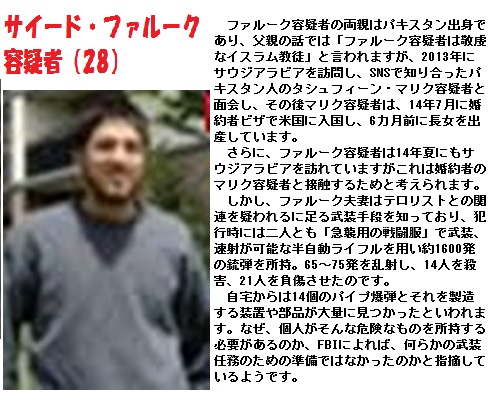 米銃乱射事件、銃撃犯は男女2人 ―― 【ロサンゼルス共同】米西部カリフォルニア州サンバーナディーノの福祉施設で2日起きた銃乱射事件で、警察は銃撃犯を男女2人と特定し、男は米国人のサイード・ファルーク容疑者(28)、女はタシュフィーン・マリク容疑者(27)=国籍不明=と発表。2人とも警察に射殺された。