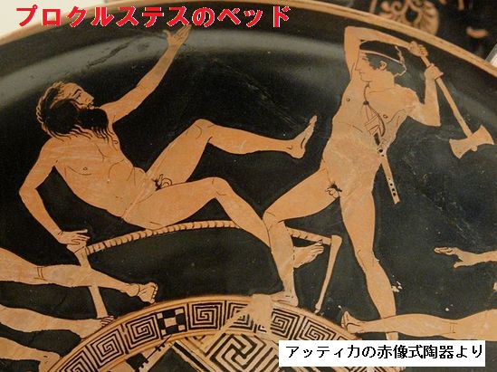 道中、テーセウスが倒したプロクルーステースは「プロクルーステースのベッド(寝台)」(Procrustean bed)の逸話で有名です。この山賊は旅人に寝台を勧め、大きな寝台より背が小さければ、旅人の手足を無理やり引っ張ることで殺してしまったのです。また、小さな寝台から手足がはみ出せば、旅人の手足を切り落として殺してしまいました。そこから「無理矢理、基準に一致させる」という意味になったそうです。