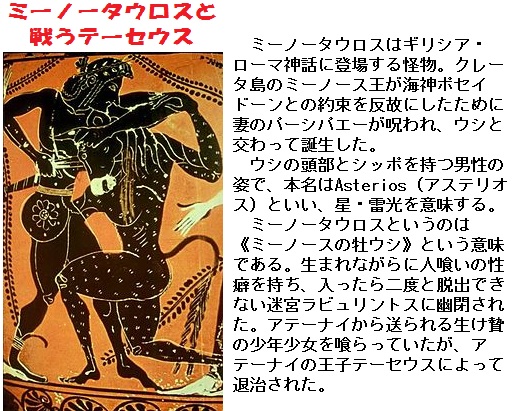 神話によるとMīnōs王(ミーノース王、Krētē〈クレーテー〉島の王)は後で返すという約束でPoseidōn(ポセイドーン)に願って海から美しい白い雄牛(一説では黄金)を得ます。しかし、雄牛の美しさに夢中になった王は、ポセイドーンとの約束を違え、白い雄牛を生け贄に捧げず、代わりの雄牛を生け贄として捧げ、白い雄牛を自分の物にしてしまいます。これに激怒したポセイドーンはPāsiphaë(パーシパエー、ミーノースの妻)に呪いをかけ、后は白い雄牛に性的な欲望を抱くようになります。Daidalos(ダイダロス、ギリシア神話に登場する有名な大工、工匠、職人、発明家です。「聡明な働き手」という意)に命じて雌牛の模型を作らせた彼女は、自ら模型の中へと入り雄牛の身近へと訪れるのでした。結果、パーシパエーはMīnōtauros(ミーノータウロス)を産むこととなったといいます。星、雷光を意味するAsterios(アステリオス)と名づけらますが、「ミーノース王の牛」を意味するMīnōtauros(ミーノータウロス)と呼ばれました。