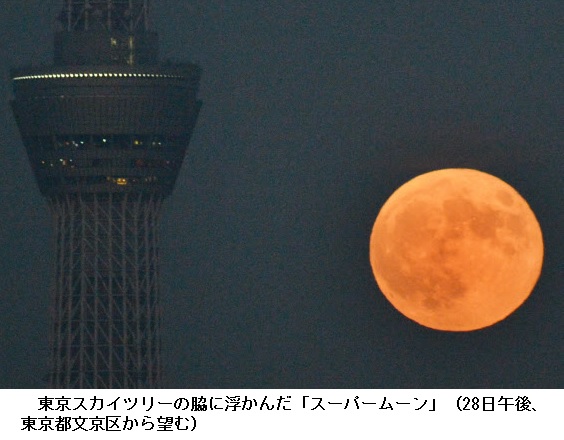 「スーパームーン」くっきり 地球に接近、満月の時期と重なる ―― 月が最も地球に近づいて、満月の時期と重なる「スーパームーン」が28日、世界各地で観測され、国内でも普段よりも一回り大きな月がくっきりと姿を現した。