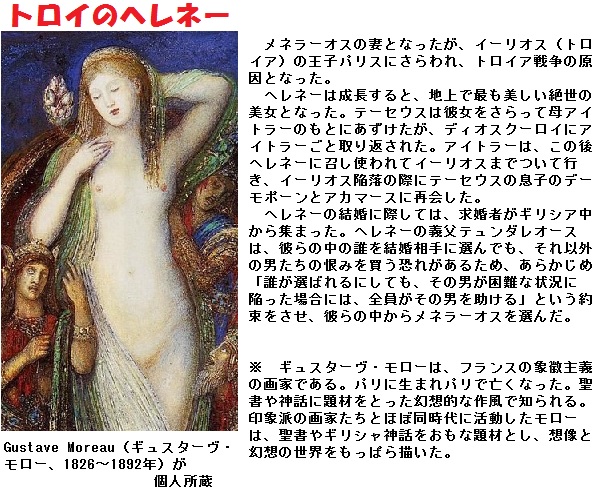 二人はSpártā(スパルタ)にいたヘレネーを攫い、アテーナイまで連れて帰ることに成功。いずれスパルタがヘレネー捜索に動きだすので、戦争を避けたいテーセウスは、ヘレネーを母Aithrā(アイトラー)にゆだね、アテーナイから離れた場所に隠しました。