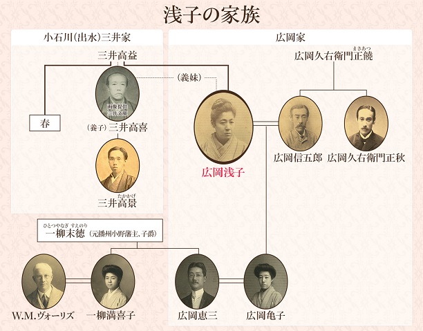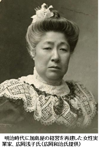 日本の実業家、教育者、社会活動家。1849年10月18日、山城国京都(現・京都府京都市)の豪商・三井高益の4女として生まれる。67年、17歳で大坂の豪商「加島屋」の次男・広岡信五郎に嫁いだ。同年11月の大政奉還により、加島屋は大名への貸し金総額900万両(4500億円相当)を無にするところだったが、浅子は諸藩に出向き返済を迫ったという。明治維新の動乱期からは実業家として尽力、鉱山の再建に携わり、加島銀行や大同生命も創業、加島屋を財閥に育て上げた。教育者としても力を注ぎ、大阪に梅花女学校を設立していた成瀬仁蔵らと各界の有力者に働きかけ、1901年に東京都文京区目白台に「日本女子大学校」(現日本女子大学)を設立させた。02年に夫が死去すると、一人娘に養子を迎え実業界から引退。11年、洗礼を受け日本キリスト教中央委員となり、遊郭の女性救出を始めとした社会活動を行う。19年1月14日、死去。享年70。15年1月、浅子を主人公とした『小説 土佐堀川―女性実業家・広岡浅子の生涯』(古川智映子著、潮出版社)を原案とし、NHK朝の連続テレビ小説「あさが来た」が同年後期より放映されることが発表された。