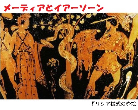 コルキスの王女Mēdeia(メーディア)は冥界の女神であるHekátē(ヘカテー、ギリシア神話の女神の1人)の神殿に仕える女神官で、ヘカテーの魔術に長(た)け、イアーソーン率いるアルゴナウタイの冒険を成功に導いたといいます。このメーデイアはAthēna(アテーナイ)を訪れたとき、アテーナイのAigeus(アイゲウス)王は喜んで迎え、魔女Mēdeia(メーデイア)と結婚したといいます。