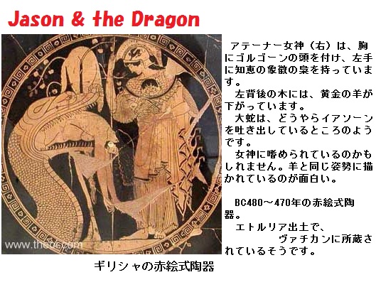 ※ 竜の歯:Kadmo(カドモス、Thēbai〈テーバイ〉の建設者。Delphoi〈デルフォイ〉の神託によって白牛に導かれてBoeotia〈ボイオティア、アッティカの西北に位置した一地方〉に着き,泉を守る怪竜を殺し,その歯を抜いて地に植えると戦士が地中からとび出してきて、テーバイの建設を助けたといいます)がテーバイで播いた残りの半分をアイエーテースがAthēnā(アテーナー)から貰ったものであったといいます。