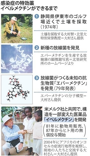 大村氏が自然界に存在する抗生物質の探索に本格的に乗り出したのは、米国留学から帰国して北里研究所に研究室を持った1973年。翌年、静岡県内で採取した土から新種の放線菌を発見し、菌が生み出す未知の抗生物質を見つけた。79年に学会で発表した「エバーメクチン」はその後、寄生虫が引き起こす家畜の感染症の特効薬となり、アフリカや中南米で毎年3億人を超える人々を感染症から救うことになった。