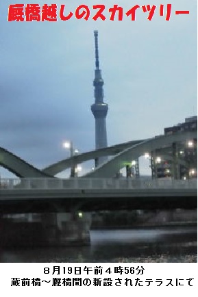 昨日も朝4時前に家を出て、足を蔵前橋まで伸ばして桜橋~蔵前橋を一周してきました。家を出ると桜橋を渡り、向島の遊歩道を南下します。吾妻橋東詰めでテラスにおり、隅田川に沿って蔵前橋東詰めまで南下、蔵前橋を渡り、東詰めの首尾の松のところでテラスに降りると、最近新装された蔵前橋~厩橋間のテラスを通り、吾妻橋東詰めまで北上します。あとは何時ものコースで帰宅しました。
