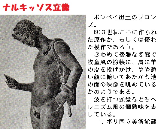 ※ アプロディーテーは美と愛の愛と美の女神です。美しさと人を愛する喜びを与えたはずなのに、自分の美だけを誇り、他者への愛を馬鹿にするナルキッソスに彼女は腹を立てたものだと思われます。