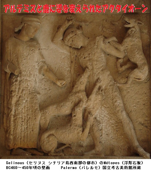 50頭の猟犬を連れてKithairon山(キタイローン山、ギリシャ中央にある全長16kmの山麓)で狩猟中、女神アルテミスの入浴中の裸体を誤って目撃してしまったために、報(むく)いとしてかの女神アルテミスによって鹿へと姿を変えられ、連れてきていた自分の猟犬に食い殺されてしまいます。一説にはわざと鹿皮をアクタイオーンに被せて猟犬に襲わせたともいわれています。鹿に変えられた理由の異説として、アクタイオーンが自らの狩猟の腕を誇って女神を軽んじたからだとも、叔母のSemelē(セメレー、Zeus〈ゼウス〉の子Dionȳsos〈ディオニューソス〉の母)と結婚しようとしてゼウスと争ったためだとする説もあります。また、後に猟犬たちは鹿の正体を知って大いに悲しんだが、それを知ったケイローンがアクタイオーンそっくりの銅像を作って慰めたといいます。