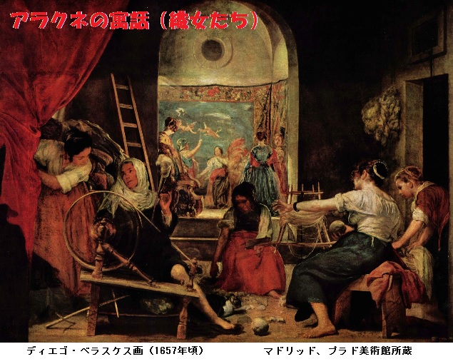 Ovidius(オウィディウス)の『変身物語』によればアラクネーは優れた織り手で、その技術は機織りを司るAthēnā(アテーナー)をも凌ぐと豪語するほどでした。これを耳にしたアテーナーは怒りを覚えますが、彼女を諭す為に老婆の姿を借りて神々の怒りを買うことのないように忠告を与えました。しかし、アラクネーはそれを聞き入れるどころか、神々との勝負を望んだ為、女神は正体を表してアラクネーと織物勝負をすることになりました。