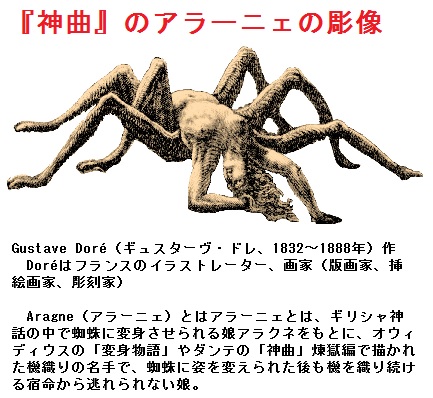 Dante(ダンテ)の『神曲』「煉獄篇」では、煉獄山の第一層にて「傲慢」の大罪を戒める例の一つとして、すでに下半身が蜘蛛に変じたアラクネーを写した姿が山肌に彫刻されています(原文の「Aragne(アラーニェ)」の名で邦訳されていることもあります)。