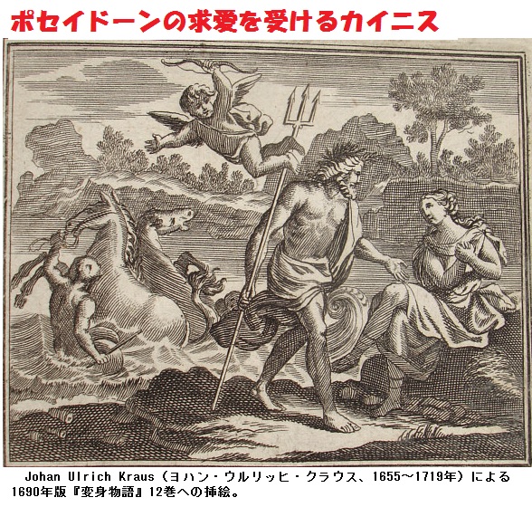 Ovidius(オウィディウス)の『変身物語』によれば、Kainis(カイニス)はThessalía(テッサリアー、ギリシャ中部の地域名)で最も美しい乙女だったので、多くの求婚者がいましたが、どんな男が現れてもカイニスは夫に選びませんでした。あるときカイニスが海岸を歩いていると、海神Poseidōn(ポセイドーン)が現れ、彼女を強姦してしまいます。ポセイドーンが償いとして願いを何でもかなえると言ったところ、カイニスはこんな酷いことが2度とないように男に変えてほしいと願ったのでした。そこでポセイドーンはカイニスを不死身の身体をもつ男に変えてしまったのです。