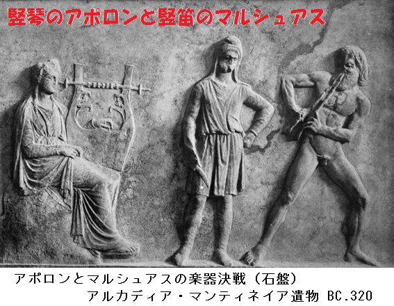 アウロスを得たマルシュアースはこの楽器に熟達し、Apollōn(アポローン)のkithara(キタラー、竪琴の一種)にも勝るとの声望を得るに至ります。これがアポローンの耳に入って怒りを買い、マルシュアースはアポローンと音楽合戦をする羽目に追い込まれてしまいました。