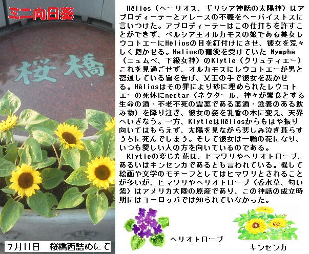 雨または曇り空の毎日でしたが、昨日、今日と夏日がやってきたようです。今日の早朝徘徊は、桜橋~吾妻橋の間を一周して、帰宅しました。桜橋の4つの出入り口には、橋名の標識を囲んで、ミニヒマワリが円形に植えられています。