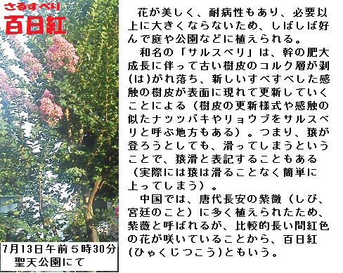 橋場・今戸のテラスを往復して、帰宅する。山谷掘り公園を横切って、聖天公園を通ると、公園の入口に百日紅(さるすべり)の木がピンクの花を付けていました。