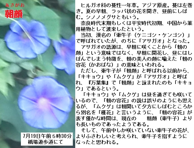 今朝は石浜通りを白鬚橋まで北上、橋を往復して、橋場・今戸の遊歩道に入りました。この遊歩道は現在防潮堤の耐震工事途中から通行止めになっています。最初のテラスの昇降口までの間の遊歩道に沿った茂みには朝顔が纏わり付いて、散在して咲いています。