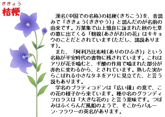我国最初の漢和辞典「新撰字鏡」(901年頃:僧 昌住著)の「桔梗、阿佐加保(アサカホ) 又云 岡止々支(オカトトキ=桔梗の別名)」の記述や、歌の内容などによって「桔梗」とするのが現在ではほぼ通説となっているようです。