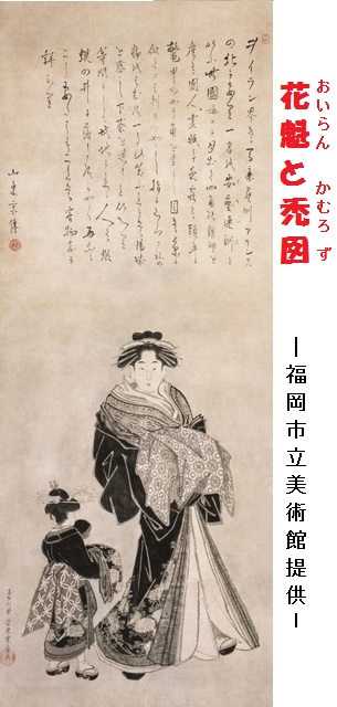 同展を監修する国際浮世絵学会の石田泰弘理事が4月、東京のコレクターから所蔵していることを明かされ、「花魁と禿図」と名づけた。床の間に掛けるよう表装されており、紙の大きさは縦117.6センチ、横46..3センチ。上部に、大衆文学を手がける人気戯作(げさく)者だった山東京伝(さんとうきょうでん)の賛文がある。