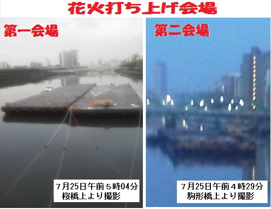 今夕は「第38回隅田川花火大会」が催されますので、桜橋を渡ると道の片側は場所取りの人々でいっぱいです。会場は桜橋下の第一会場と駒形橋・厩橋間の第二会場とがあって、何れも川面に曳いて来た大きな浮き桟橋の上から打ち上げられます。少々ピンボケになってしまいましたが、両会場に曳いて来られた浮き桟橋を写真に収めてきました。