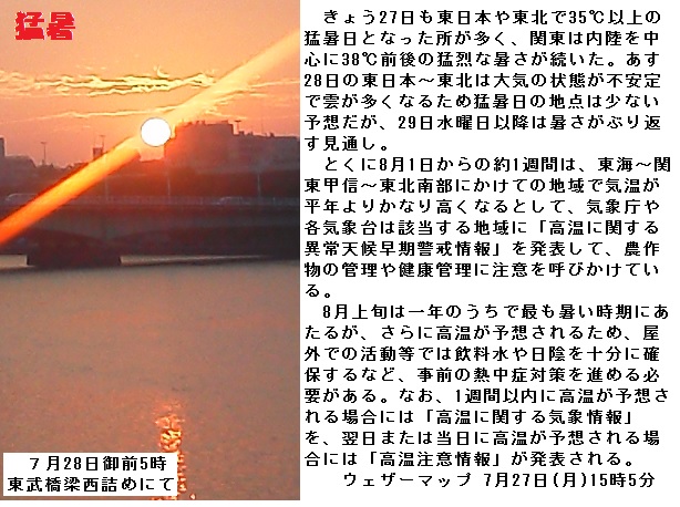 昨夜は夜中に目が覚めると、汗びっしょり。それから眠れず、今朝も3時40分頃、家を出ました。川風が肌に気持ちよく感じます。桜橋~駒形橋を一周して帰宅しました。太陽が出ると、風が無くなり体が汗ばんできます。家に帰って温度計を見ると30℃を示しています。朝っぱらから早速クーラーをいれます。