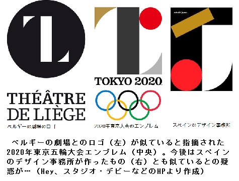 2020年東京大会のエンブレムをめぐっては、フランスのデザイン事務所「スタジオ・デビー」が2013年にベルギーの劇場のために制作したロゴと書体が似ているという指摘が話題になっている。