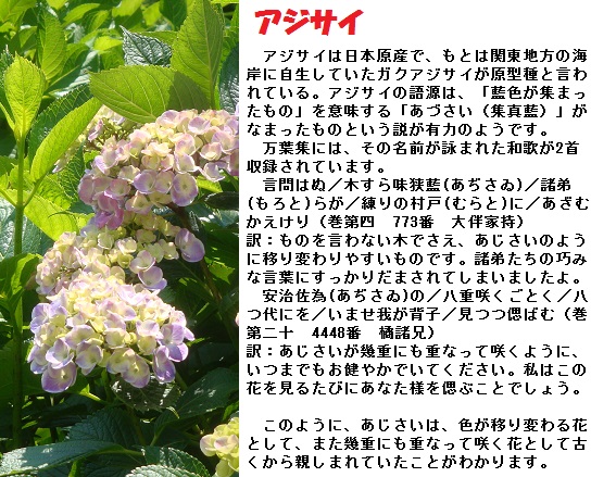 隅田公園にはあちこちとアジサイが植えてあります。日本語で漢字表記に用いられる「紫陽花」は、唐の詩人白居易(772~ 846年)が別の花、おそらくライラックに付けた名で、平安時代の学者源順(みなもとのしたごう、911~983年)がこの漢字をあてたことから誤って広まったといわれています。