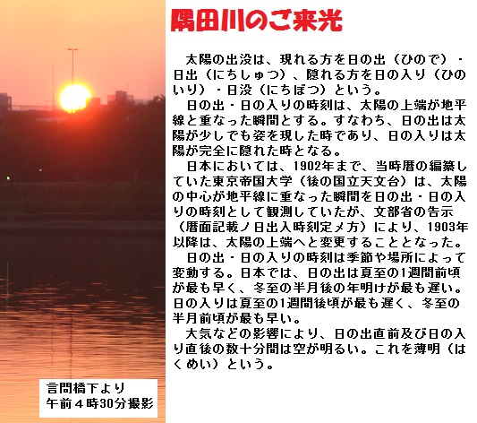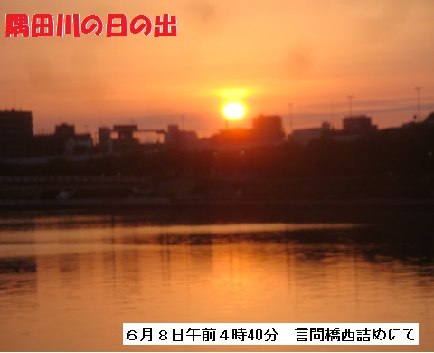 関東地方の梅雨入りのニュースはまだありません。今朝も4時に起床、4時20分頃家を出て、隅田公園を一回りしてきました。言問橋の西詰めに来た頃向こう岸から真っ赤な太陽が昇ってきました。時計を見ると4時40分 ―― 因みに新聞の「今日の暦」欄によると今日の日のでは4時25分とありました。まあ、何時もの見慣れた光景ではありますが、カメラに納めました。