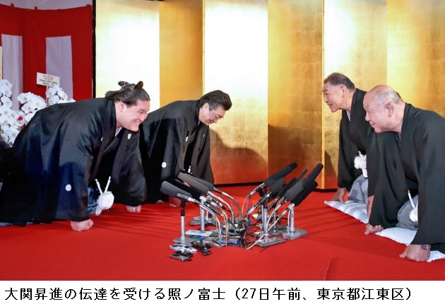 照ノ富士、大関昇進!「心技体の充実につとめ、さらに上を目指して精進」―― 日本相撲協会は27日午前、東京・両国国技館で開いた大相撲名古屋場所(7月12日初日・愛知県体育館)の番付編成会議と臨時理事会で、夏場所で初優勝を果たした関脇・照ノ富士(23)=伊勢ケ浜=の大関昇進を満場一致で決めた。/伝達式の口上では「今後も心技体の充実につとめ、さらに上を目指して精進いたします」と述べた。北の湖理事長は「横綱になるという気概を持って頑張ってほしい」と期待を込めた。三役2場所での通過は年6場所制となった1958年以降では初の快挙となった。/また3月の春場所に幕下10枚目格付け出しでデビューした御嶽海(22)=出羽海=と、高木改め高立(たかりゅう、23)=木瀬=の新十両昇進も発表された。御嶽海は逸ノ城、遠藤らと並び昭和以降最速となる初土俵から所要2場所での新十両。再十両は徳真鵬(31)=木瀬=のみだった。/照ノ富士「今までで一番うれしい。支えてくれた人がいるからこそ、今の地位がある。この上を目指して頑張りたい。横綱は神様が選ぶもの。選ばれるように努力していきたい」/照ノ富士の師匠・伊勢ケ浜親方(元横綱・旭富士)「優勝を目指すのが大関。まだ覚えることがたくさんある中での昇進なので、先々が楽しみ。(指導は)もっと厳しくなるだろう」 (2015年5月27日10時23分 スポーツ報知)