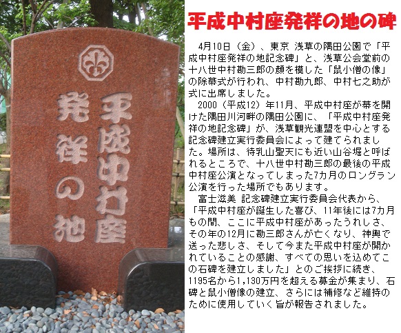 今朝もお決まりのコースを徘徊 ―― 終わりに近づいて、待乳山聖天の真ん前にある隅田公園の入口に「平成中村座発祥の地」という碑が建っていることに気付きました。4月10日に建立されたそうですが、ちょうど爺の入院騒ぎの真直中で今日まで気付かずにいたのでしょう。