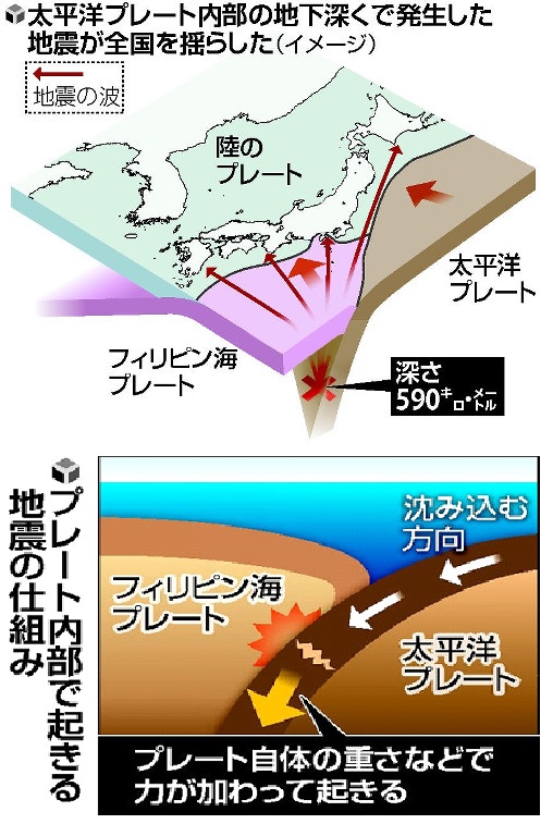 気象庁によると、震源は深さ約590kmで、太平洋プレートと呼ばれる巨大な岩板の内部だった。東京大地震研究所の古村孝志教授によると、日本列島やその周辺の海では、複数のプレートが複雑に重なり合っている。太平洋プレートは最も深い位置にあり、フィリピン海プレートなどの下に沈み込んで、日本列島の地下深くまで続く。