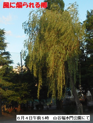 今朝は少々風が強いようでしたが、隅田公園を散策してきました。昨日は1日中雨でしたが、今朝はからりと晴れ強い風も爺には爽やかに感じられました。山谷堀水門広場にある大柳が風に煽られて大きく揺らいでいました。