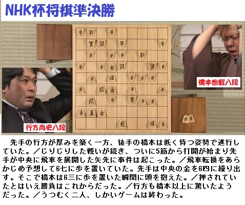 行方尚史八段vs橋本崇載八段、どちらが勝っても初の決勝進出となりますが、結果から言うと思わぬ結果になってしまいました。後手の橋本崇載八段の二歩反則負け、この衝撃的な幕切れを、テレビでじかに見ることとなりました。