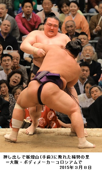 稀勢の里、あっけなく土 「台風の目」手も足も出ず ―― (8日、大相撲春場所初日)/ご当地場所の初日を白星で飾った豪栄道に沸く館内が、一瞬でため息に覆われた。同じ大関の金看板を背負う稀勢の里が、あっけなく敗れた。栃煌山を相手に立ち合いで踏み込めない。相手の左差しに腰が浮く。逆襲の手も出ないまま土俵際に追い込まれると、最後は仰向けで飛ばされた。/この場所、北の湖理事長(元横綱)は「台風の目」と期待していた。過去2場所は連続で11勝を挙げた。本人も場所前の稽古で「きついことをやろう」と心に決め、腰を割ったすり足を繰り返した。出稽古に来た新小結の玉鷲らに約40番も胸を出した日もあった。/ だから、昨年の初場所以来、大関昇進20場所目で3度目の初日黒星はよほどこたえたか。風呂から上がった大関は「くそっ」とつぶやき、細かいまばたきを繰り返した。唇をかみ、何を聞かれても終始無言。帰り支度が終わらない付け人を置き去りにして支度部屋を出ていった。/昭和以降では貴乃花(元横綱)に次ぐ歴代2位の若さの18歳3カ月で新入幕を果たした逸材も7月には29歳になる。師匠の田子ノ浦親方(元幕内隆の鶴)は「もう一段上に行くには、突き、押しを貫くしかない。それでこそ本当の強さが出る」と語るが、初日はほど遠い相撲で土俵を割った。/鶴竜が休場し、初優勝を目指す大関にも初っぱなで土。「荒れる」と言われる春場所に、白鵬を脅かす存在は出てくるのか。