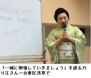 おもてなし英会話 浅草芸者・乃り江さん 商店連合会主催で講習会 ―― 海外からの観光客も多い浅草で、接客の最前線で働く地元の芸者さんに生きた会話を学ぶ「おもてなし英会話講習会」が6日、台東区浅草の浅草JRAパークホールで開かれた。協同組合浅草商店連合会が主催し、物販や飲食店の経営者、従業員など約100人が参加した。/講師を務めたのは、留学経験があり、英語や中国語などに堪能な浅草芸者、乃り江(本名・鹿島菊乃)さん。開口一番、「いらっしゃいませは Welcome(ウエルカム)。でも、『ありがとうございました』のように、美しい日本語はあえて英語で言わなくてもいいのでは」と語りかけた。/「靴を脱いでください」「傘をお預かりします」「人数分の料理を注文してください」「料理の持ち込みはやめてください」。事前のアンケートを基に作られたテキストは、いずれも日々の商売で困った場面が題材だ。/浅草では一昨年、浅草料理飲食業組合の主催で同様の講習会が開かれたが、講師は一般の英語講師だった。「実践の勉強がしたかった」と、今回の講習会を企画した同連合組合理事の清水祐子さんは説明する。/スリッパのまま座敷に上がる客に戸惑ったという日本料理店の女将(おかみ)、井上ひとみさんは「外国人のお客さまに鍋料理の火加減をどう説明するか、日々辞書を見ながら勉強しています。次回も参加したい」と満足そうに店へ向かった。/既に次回開催の希望も寄せられたという。乃り江さんは「お客さまに、浅草に来てよかったと思って帰ってもらうのが私たちの願い」と語った。 (東京新聞 2015年3月7日)