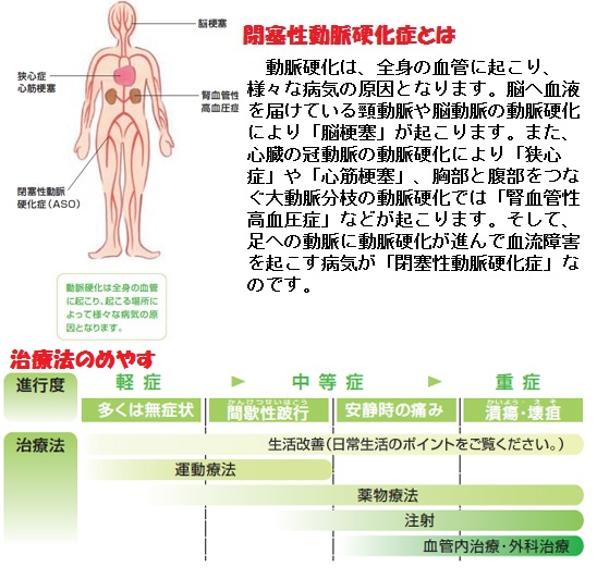 昨日12日(木)は三井記念病院で血圧脈波検査を受け、心臓血管外科医の診察を受けました。右足の骨盤を通って大腿部に到る動脈に動脈硬化による閉塞症が見られるとのことでした。動脈硬化は、全身の血管に起こり、様々な病気の原因となるとのことで、脳へ血液を届けている頸動脈や脳動脈の動脈硬化により「脳梗塞」が起こり、また、心臓の冠動脈の動脈硬化により「狭心症」や「心筋梗塞」、胸部と腹部をつなぐ大動脈分枝の動脈硬化では「腎血管性高血圧症」などが起こるとのことです。そして、足への動脈に動脈硬化が進んで血流障害を起こす病気が「閉塞性動脈硬化症」なのだそうです。