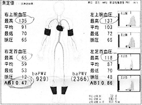 検査の結果は右足首の血圧が左足首の半分しかないということです。脈波も右足首が弱いということです。