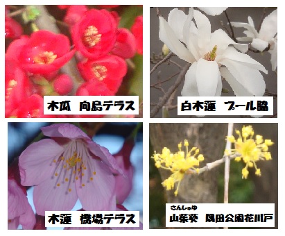 此処2・3日、風が強く肌に冷たく感じましたが、午前の徘徊は続けています。天気は春の陽射しで、公園やテラスでは木々の花が咲き誇り、目を楽しませてくれます。