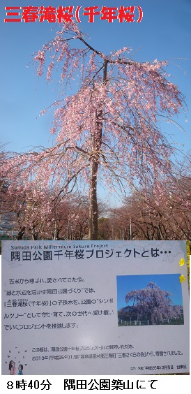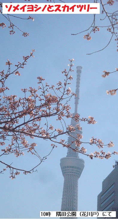 今日は3月の末日、隅田川の桜(ソメイヨシノ)はどうやら満開のようです。例年に比べると5日も早いそうです。向島のテラスを通る時はまだ夜が明け切れていませんが、吾妻橋を渡るころはすっかり明るくなります。朝日に照らされた満開の花を楽しみながら桜並木の下を歩いて帰宅しました。桜橋の水上バス発着場の遊歩道への上り口で塾友のO氏に追いつかれました。早朝の徘徊でO氏と会うのは久し振りでした。