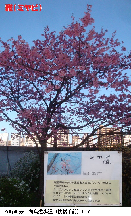 改築した築山には三春滝桜(千年桜)が植えられ、花を付けていました。山谷堀水門の傍に植えられたソメイヨシノは3分咲きというところです。枕橋に近い向島遊歩道には皇太子妃に肖(あやか)ってつけたという「雅(ミヤビ)」という桜がほぼ満開の花を付けていました。吾妻橋を渡って隅田公園に入ると、三分ざきのソメイヨシノ越しに春霞にかすんだスカイツリーが見られます。