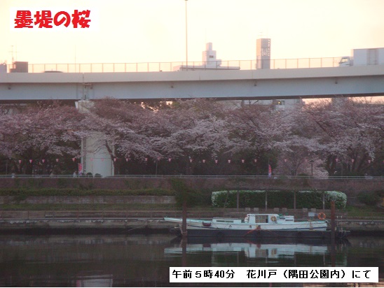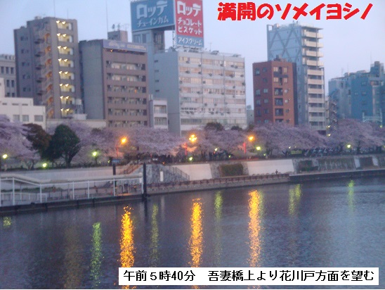 吾妻橋を渡るころ、やっと明るくなり、墨堤の千本桜がはっきり見渡されるようになり、足取りを軽くしてくれるようです。