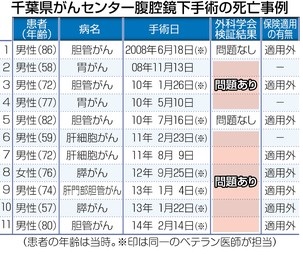 <千葉県がんセンターの患者死亡問題> 昨年4月、腹腔鏡を使った手術で患者が相次いで死亡していたことが発覚。県は同6月に原因究明と再発防止を目的とする第三者検証委員会を設置。これまで8回開催され、死亡した11人の事例について、医療の専門的見地からの調査・検証を日本外科学会に委ねた。同センターは日本肝胆膵外科学会により、高度な手術例が多い「修練施設」として「A認定」されている。体に数カ所の穴を開け、カメラ(腹腔鏡)や操作器具を挿入して行う手術は開腹手術に比べて体の負担が少ないのが利点だが、高度な技術が必要とされる。 (東京新聞 2015年3月26日 朝刊)