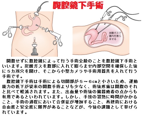 医師の説明によると、今の所、再手術は腹腔鏡手術を予定しているということです。群馬大学や千葉がんセンターの例もありますが、患者としては手術の医師を信じるしかありません。まあ、腹腔鏡下手術は日本で1万例ほど行われているといいますから、群馬大学や千葉がんセンターの例は特別な例と考えるしかありません。どんな小さな手術でも死と隣り合わせにあると思って、運を天に任せて手術に臨む覚悟でいます。