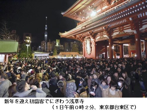 1年の幸祈り…浅草寺初詣客の列、350m超も ―― 2015年が幕を開けた1日、東京都台東区の浅草寺は、新年を祝う大勢の初詣客でにぎわった。/浅草寺によると、参拝客は31日午後9時頃から並び始めたという。午後11時半の時点では、列は本堂から約350m離れた雷門よりも先まで続いていた。/1日午前0時に新年を知らせる鐘が鳴ると、参拝客は次々と本堂に入り、未ひつじ年である今年1年の幸せを祈っていた。友人と2人で訪れたという千葉県佐倉市の大学2年生(20)は、この日が誕生日。「1年間、平和に過ごせますようにと祈りました」と話していた。 (読売新聞 2015年01月01日 00時45分)