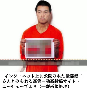 湯川さん画像?投稿 ネット、音声で「殺害」―― イスラム教スンニ派の過激派組織「イスラム国」とみられるグループに拘束された日本人二人が殺害を警告された事件で、湯川遥菜(はるな)さん(42)=千葉市花見川区=が殺害された可能性のある画像が二十四日深夜、インターネット上に公開された。湯川さんが殺害されたとする英語の音声も付いていた。政府は湯川さんと、フリージャーナリスト後藤健二さん(47)=東京都港区=の安否や、画像の真偽の確認を急ぐ。/政府は二十五日未明、関係閣僚会議を開催。安倍晋三首相は、首相官邸で記者団に「(事実なら)言語道断。許し難い暴挙だ。ただちに解放するよう(犯人グループ側に)強く要求する」と話した。「イスラム国」はこれまで人質とした米国と英国の計五人を殺害しているが、湯川さん殺害が事実だとすれば、「イスラム国」への空爆参加国以外では初の犠牲者となる。/画像では、後藤さんとみられる男性が写真を持ち、その写真に遺体のようなものが写っていた。後藤さんを名乗る男性の声で英語のメッセージが付き、「ご覧のように、私とともに拘束された遥菜は殺された」と述べた。「アベが遥菜を殺した」と、安倍首相を名指しする表現もあった。/「身代金はもう要求していない」とし、「刑務所に入れられている『サジダ・アル・リシャウィ』という女の釈放を条件に、私も釈放される」などと話した。/画像には「イスラム国」の広報部門である「フルカーン」のマークはない。音声は、実際に後藤さんの声かどうかは不明。「リシャウィ」は、二〇〇五年にヨルダンの首都アンマンで起きたホテル爆破事件の実行犯で、同国に拘束中の人物とみられる。/グループは二十日、二人を拘束したとするビデオ声明をネット上に発表。七十二時間以内に身代金二億ドル(約二百三十五億円)を支払わなければ殺害する、と警告した。安倍首相が十七日、「イスラム国」対策で二億ドルを供与すると表明したことについて「日本は進んで十字軍に参加した」などと批判していた。/湯川さんは、シリア北部アレッポ郊外で拘束されたとみられる画像が、昨年八月中旬にネット上で確認された。同年一月に民間軍事会社を設立し、イラクやシリアへ渡航。ブログでは、同年七月二十一日付の記述を最後に更新が途絶えた。 (東京新聞 2015年1月25日 07時08分)
