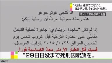 後藤さん名乗る新たな音声ネットに投稿 ―― 日本時間のけさ8時半ごろ、イスラム過激派組織「イスラム国」とみられる組織に拘束されている後藤健二さんを名乗る男性の声で、新たな音声メッセージがインターネット上に投稿されました。/音声メッセージは30秒ほどの長さで、男性の声は英語で「この音声は私が投稿するよう指示されたものだ」としたうえで、「もしも私の解放と引き換えに現地時間の29日木曜日の日没までに、リシャウィ死刑囚をトルコ国境に連れてこなければ、ヨルダン軍のパイロットのムアーズ・カサースベは即座に処刑される」としています。/投稿には後藤さんの写真などはなく、男性の声が読み上げたメッセージと同じ内容を、アラビア語で記したものが添付されています。