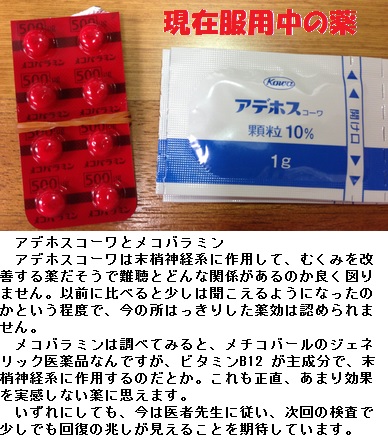 私の場合は1月6日発病で、1月9日から入院ステロイド点滴を10日間受け、以後アデホスコーワ顆粒とメコバラミン錠を毎食後服用しています。