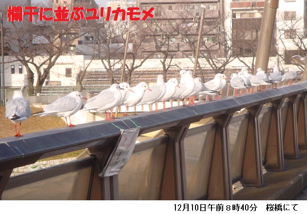 此処の所毎日小春日和が続いています。今日は多少雲がおおく、薄日の射す何時ものコースを歩いてきました。どうやら冬も本番になりユリカモメも帰って来たようです。桜橋の欄干には沢山のユリカモメの群れでびっしりです。