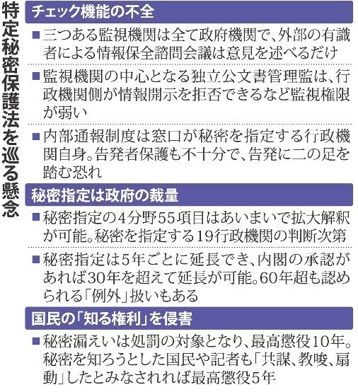 秘密保護法:10日施行 「知る権利」侵害の恐れ ―― 国家機密の漏えいに厳罰を科す特定秘密保護法が10日、施行される。安全保障に著しい支障を与える恐れのある情報を政府が特定秘密に指定して秘匿する。昨年12月に国会で採決を強行し批判を浴びたことから、安倍政権は施行に先立ち運用基準を策定、「適正な運用」を強調する。しかし根本的な改善には至らず、政府に不都合な情報の半永久的な隠蔽(いんぺい)や、国民の「知る権利」侵害への懸念が根強いままの実施となる。/菅義偉官房長官は9日の記者会見で「国民の意見を踏まえ、政令や運用基準の制定などの準備を慎重に、丁寧に進めてきた」と強調。引き続き国民の理解を得るよう努める考えを示した。安倍晋三首相は11月18日のTBSの番組で、同法の運用で「表現の自由」の侵害や報道の抑圧が起きれば辞任すると明言している。/特定秘密は外務、防衛両省や警察庁、公安調査庁など19行政機関が、安全保障上の秘匿が必要と判断した▽防衛▽外交▽特定有害活動(スパイなど)防止▽テロ防止−−の4分野55項目の情報に限って指定する。しかし基準はあいまいで、政府が指定を恣意(しい)的に広げ、政治家・官僚の不祥事の隠蔽や、情報公開の阻害につながりかねない、との懸念が残る。/指定期間は5年ごとに更新すれば、原則30年まで可能。その後は国立公文書館に移されるが、指定期間中でも首相の事前同意があれば廃棄できる。指定は内閣が承認すれば60年まで延長でき、暗号など7項目は例外として半永久的に延長できる「抜け道」もある。/特定秘密を取り扱う公務員や民間事業者による漏えいは最高懲役10年、共謀や教唆(そそのかし)、扇動(あおる行為)は同5年。従来の国家公務員法の懲役1年以下、自衛隊法の同5年以下よりも重罰化するうえ、一般人も対象になる共謀などは線引きが不明確で、政府に批判的な市民活動への規制や「見せしめ」的な立件につながる恐れも出ている。 〔毎日新聞 2014年12月09日 21時19分(最終更新 12月10日 01時40分)〕